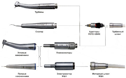 • В наборе 2 кнопочных наконечника с керамическими подшипниками, пневмодвигатель, угловой и прямой наконечники.