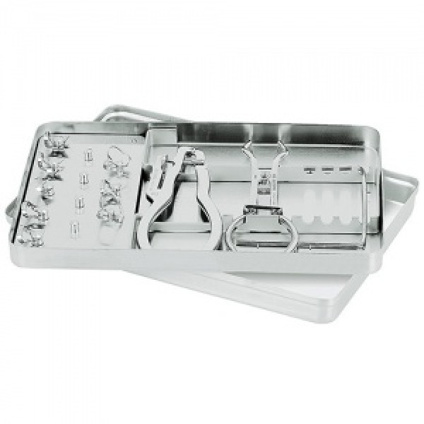 • Поднос с инструментами "Раббер Дам", нержавеющая сталь (поднос, вкладка под крепления, вкладка под инструменты, 8 креплений, щипцы)